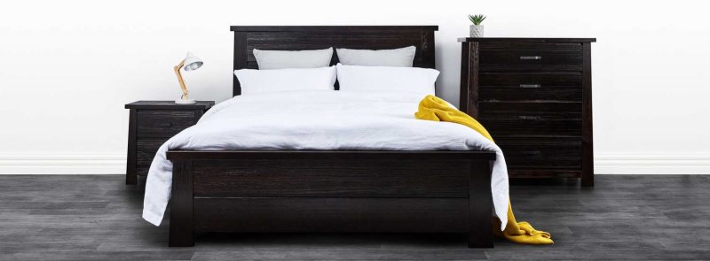 The rustic Jack super king bed frame is completed with a dark wood finish, giving a robust yet modern look, making your bedroom distinctive. 1 x Jack King Bed 2 x Jack Bedside Table  1 x Jack Tallboy Material: Veneer Warranty: 1 Year Bed Frame Dimension: H:120 X W:171 X D:207 CM Bedside Dimension: H:55 X W:54 X D:45 CM Tallboy Dimension: H:110 X W:95 X D:46 CM